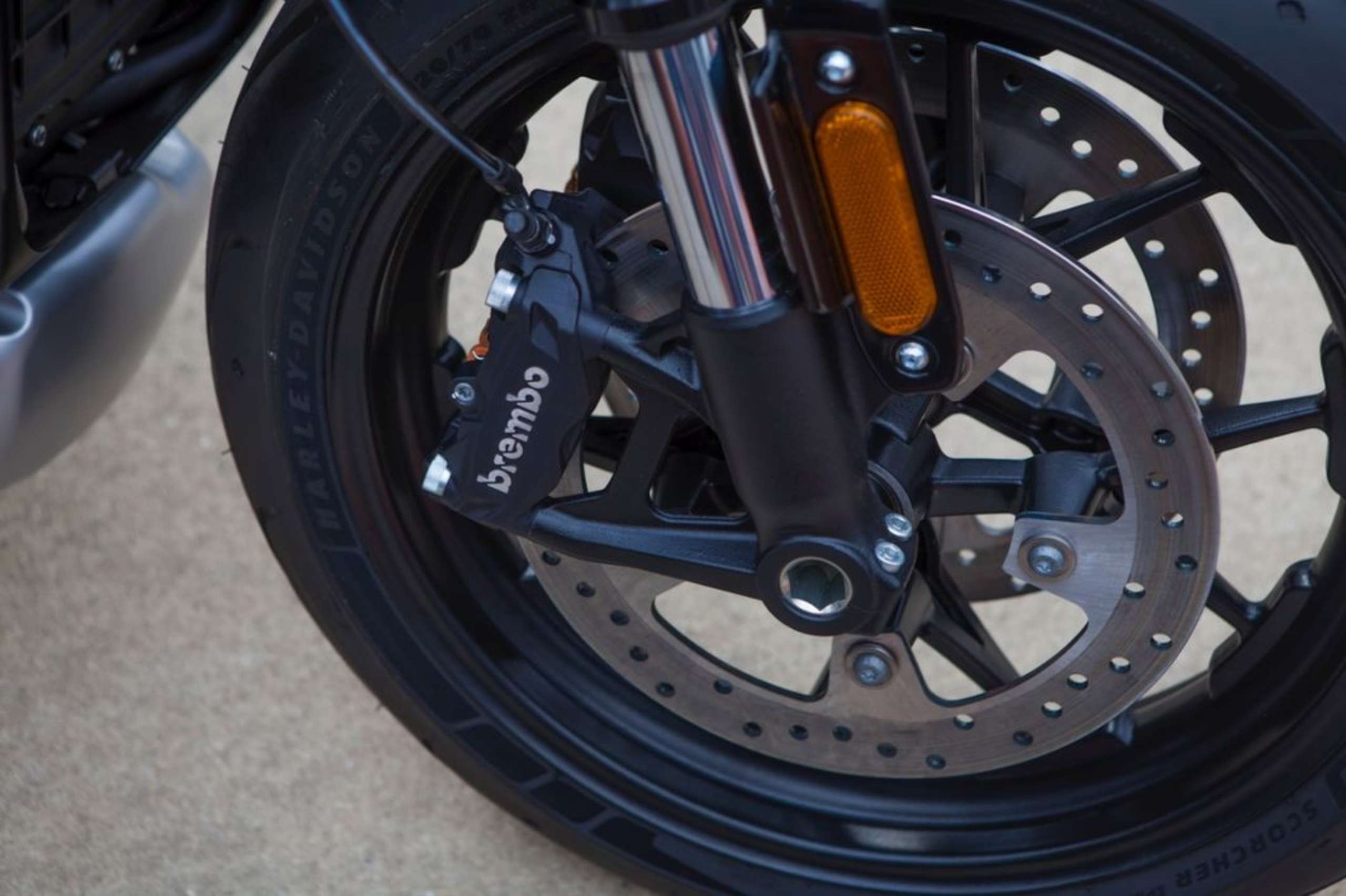 Die Bremsen kommen von Brembo und wirken mit radial montierten Zangen und Doppelscheibe vorne ebenfalls gut dimensioniert. Auf den zierlichen 10-Speichen-Alurädern befinden sich Reifen der sportlichen Dimensionen 120/70-17 und 180/55-17. Cool wie immer bei Harley sind die Farben: neben dem matten Fuse-Orange wird es im ersten Modelljahr noch glänzendes Schwarz und ein ebenfalls mattes Gelb geben.