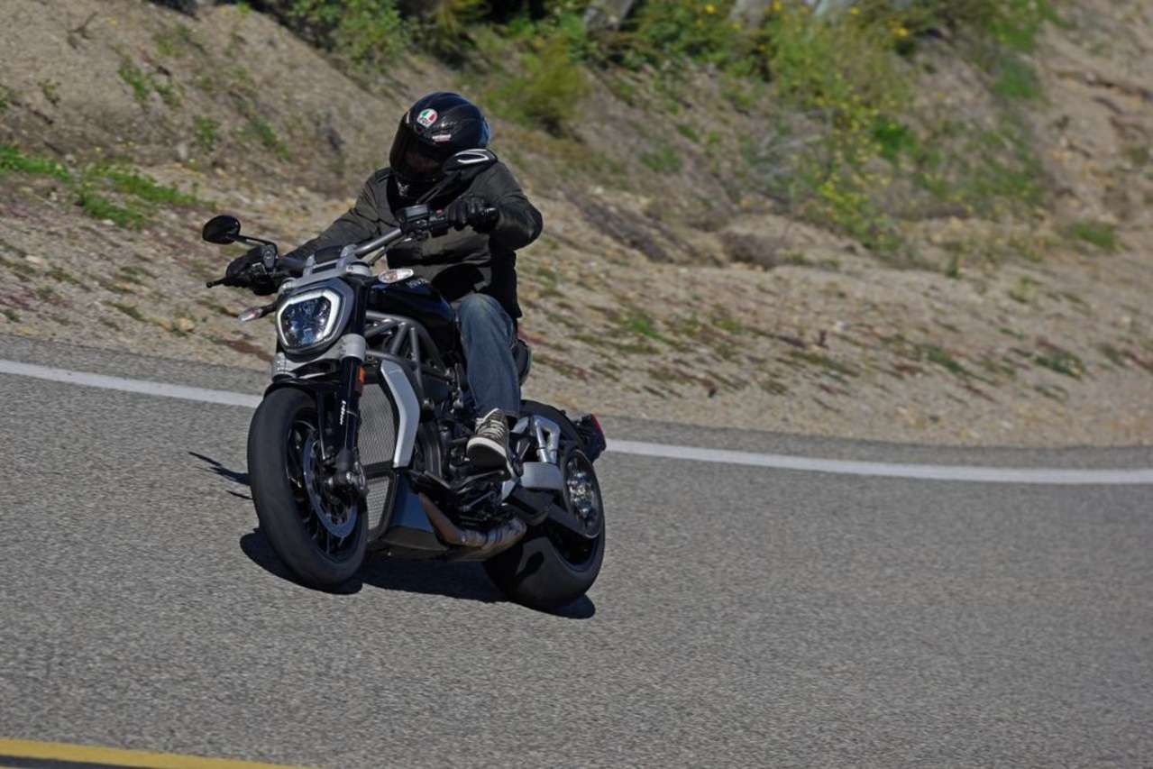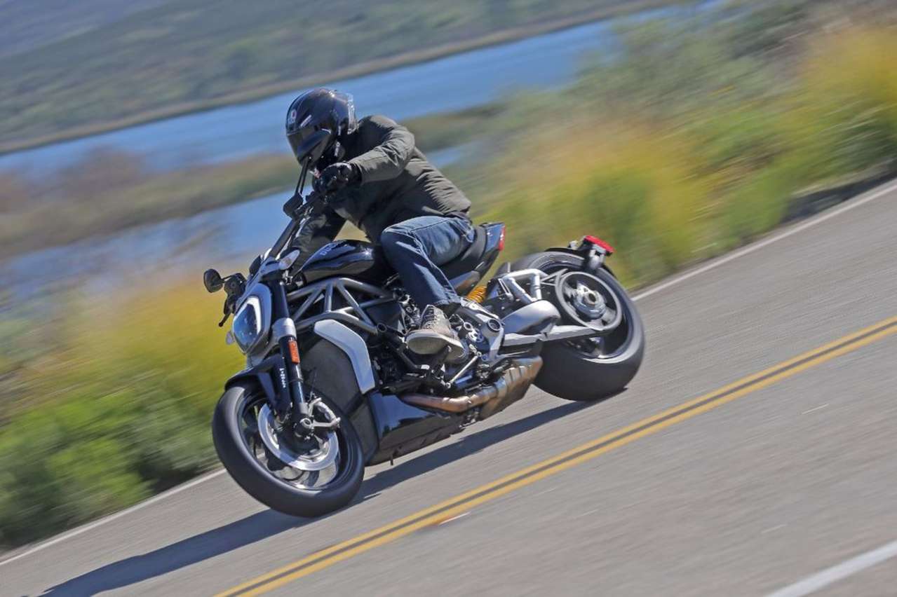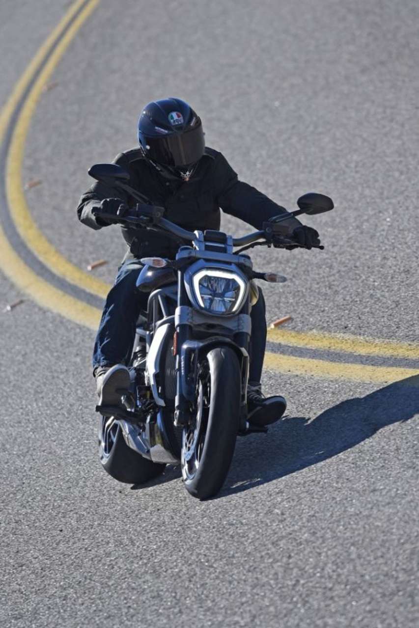 Dass sie jedoch viel mehr Talente hat als nur simples Dahingleiten und Eindruck schinden, daran lässt der ursprünglich aus Ducatis Reiseenduro Multistrada 1200 stammende V-Twin keinen Zweifel. Hubraumerweiterung auf 1262 Kubik, 129 Newtonmeter bei 5000 Touren, 156 PS bei 9500 Umdrehungen - nackte Zahlen können nicht annähernd beschreiben wie es sich anfühlt, wenn der gekreuzigte Luzifer sein 240er-Hinterrad mit maximalem Dampfwalzen-Schub gegen den Asphalt stemmt und beim Raketenstart mittels serienmäßiger Launch-Control seine geballte Kraft freigibt.