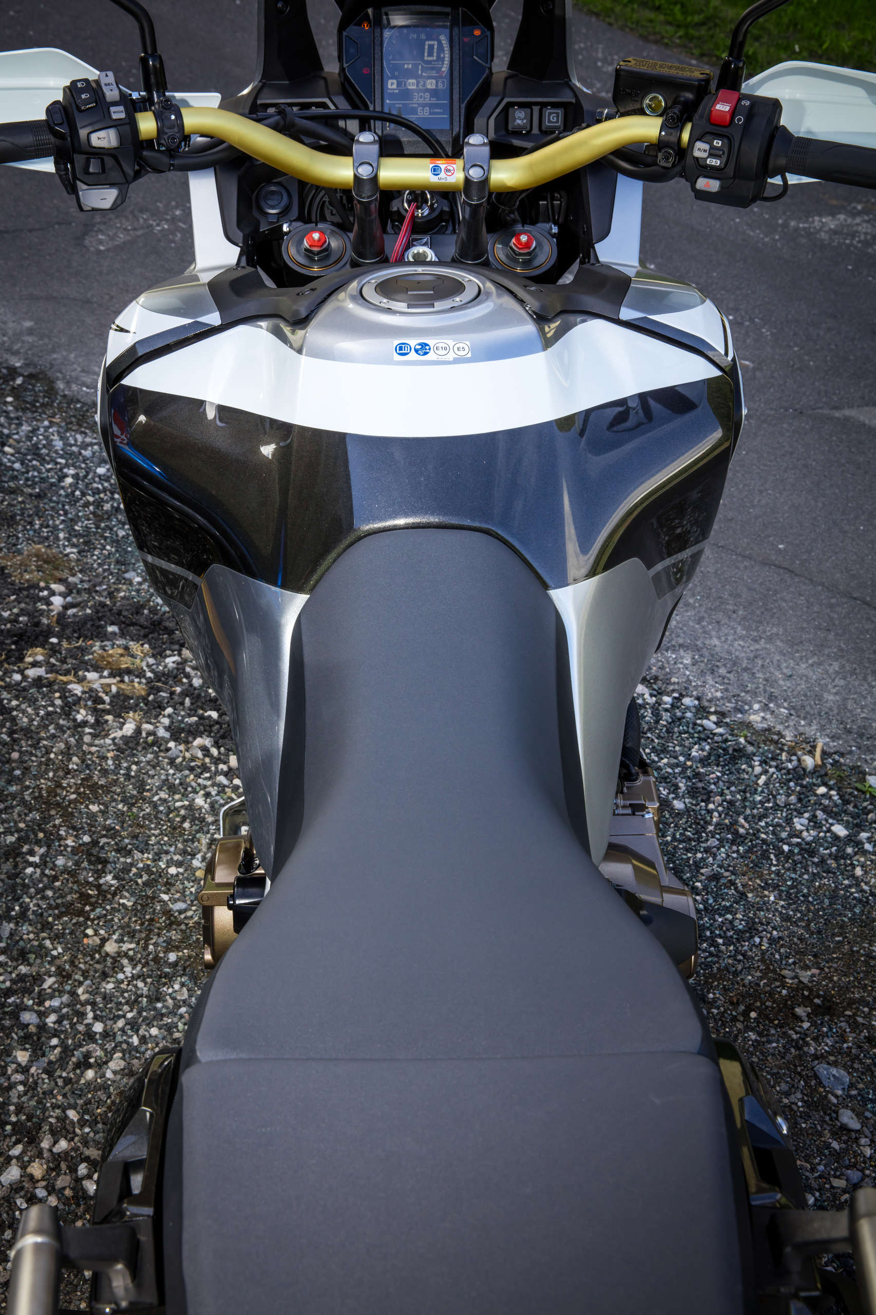 Es erschwert das Aufsteigen, Rangieren und entkoppelt den Fahrer auch ein wenig von den Vorgängen in der unteren Etage; definitiv ein Nachteil für den Straßeneinsatz, wo die Front beim Bremsen tief einsinkt und somit das Gefühl beim Verzögern verwässert. Auch die Balance ist aufgrund der schieren Höhe schwieriger; einziger Vorteil ist der enorme Federungskomfort, der sogar Schlaglöcher aus der Wahrnehmung bügelt. Ein feiner Bursche ist der Motor, der hier viel präsenter auftritt als auf der BMW: Mit stärkerem Pulsieren und einer Soundkulisse, die 2018 nachgeschärft wurde und nun fast ebenfalls schon grenzwertig ist.
