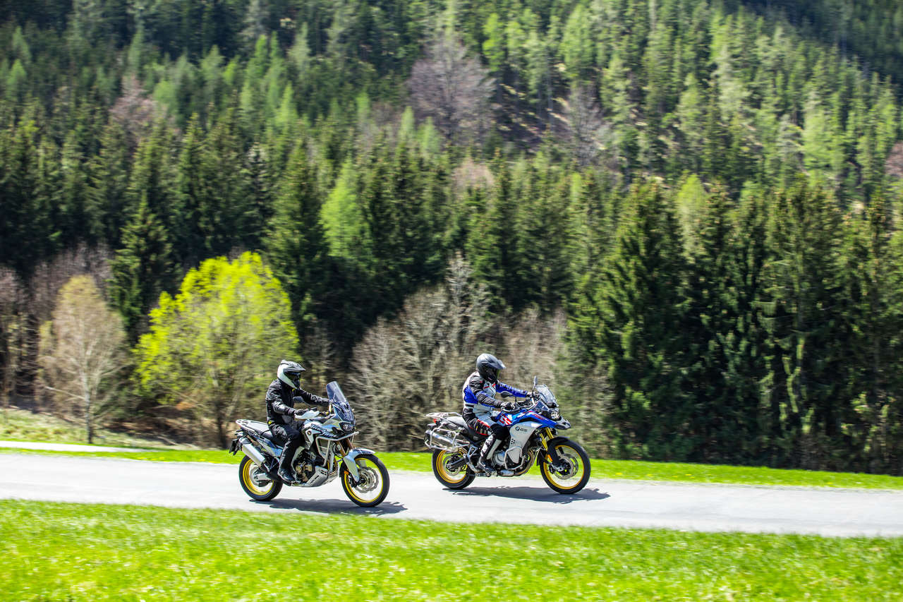 Leichte Motorräder sind weder die Adventure-Version der Africa Twin noch ihr BMW-Pendant: mit 253 Kilo (inklusive DCT) beziehungsweise 244 Kilo vollgetankt sind beiden Fahrzeugen abseits des Asphalts im Vorhinein natürliche Grenzen gesetzt. Routinierte Piloten bewältigen dank entsprechender Fahrtechnik im Flachen zwar auch äußerst technisches Terrain, ihr Limit erreichen Reiseenduros dieser Gewichtsklasse aber auf steilen Abfahrten. Hier wird der eiserne Ballast von der Schwerkraft gnadenlos nach unten gezogen, dosiert gebremste und damit kontrollierte Fahrt wird (je nach Untergrund) schwer bis unmöglich. Prinzipiell gilt daher: ohne grobe Stollenbereifung sollte man sich mit beiden Kandidaten nicht über Schotterstraßen mit moderatem Gefälle hinauswagen.