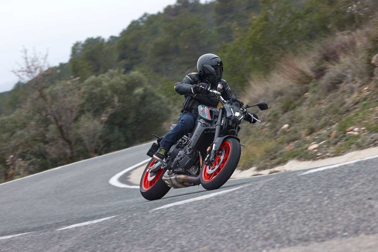Die geringeren rotierenden Massen verschärfen den Bewegungscharakter und das Handling der MT-09 noch mehr, begleitet von einem mal heiseren Schreien, mal röchelnden Gröhlen, dass es eine Freude ist. Auch im Winkelwerk sind nur leichte Lenkimpulse nötig, das meiste fährt man locker und beschwingt aus der Hüfte. Die MT-09 verkörpert die Dark Side of Japan wirklich wie kein anderes Motorrad (wir warten noch die neue MT-10 ab) und lässt einen nach dem ersten Infight euphorisch in den Helm brüllen. Die lineare Bremse und die geringeren Lastwechsel harmonisieren das Fahrerlebnis, ohne ihm etwas von seiner Aufregung zu nehmen. So muss ein performance-orientiertes Nakedbike fahren.