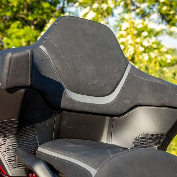 Da man ohnehin das Topcase neu gestalten musste, räumte man gleich eine zweite Baustelle auf: Die durch die Ladebox vorgegebene Rückenlehne für den Sozius steht nun deutlich schräger und ermöglicht dem Passagier eine relaxtere Haltung. Zu guter Letzt wurden die Sitzbank neu bezogen (mit einer Mischung aus Echt- und Kunstleder) sowie die beiden Lautsprecher aufgewertet.