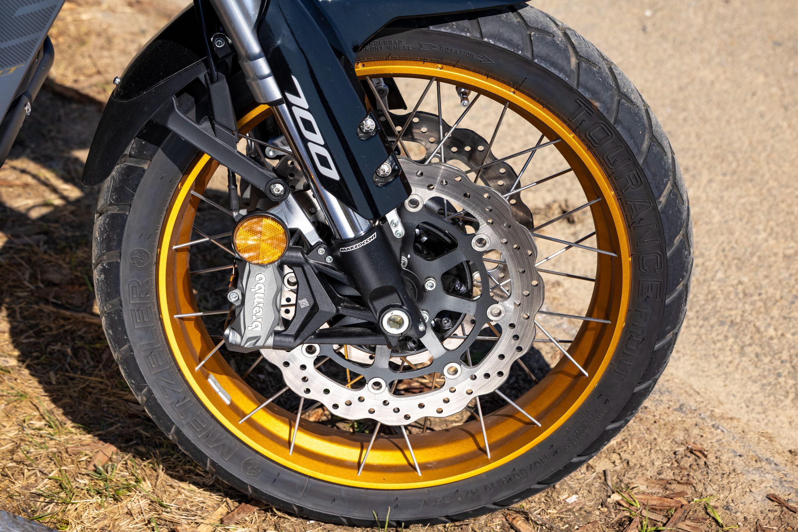 Wenn sich ein Motorrad sowohl am Asphalt als auch auf leichten Offroad-Strecken je nach Wunsch entweder bequem oder präzise verhalten soll, braucht es ein Fahrwerk mit einem weiten Einstellbereich. Das Marzocchi-Fahrwerk unserer SRT 700 SX bietet dafür eine sehr gute Basis. Die Gabel ist über die Federvorspannung und die Dämpfungs-Zugstufe justierbar, beim Federbein kann zusätzlich sogar die Druckstufe angepasst werden, was in dieser Leistungsklasse ein seltener Luxus ist.
