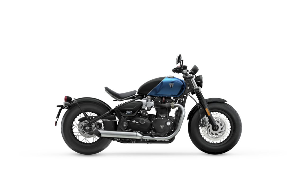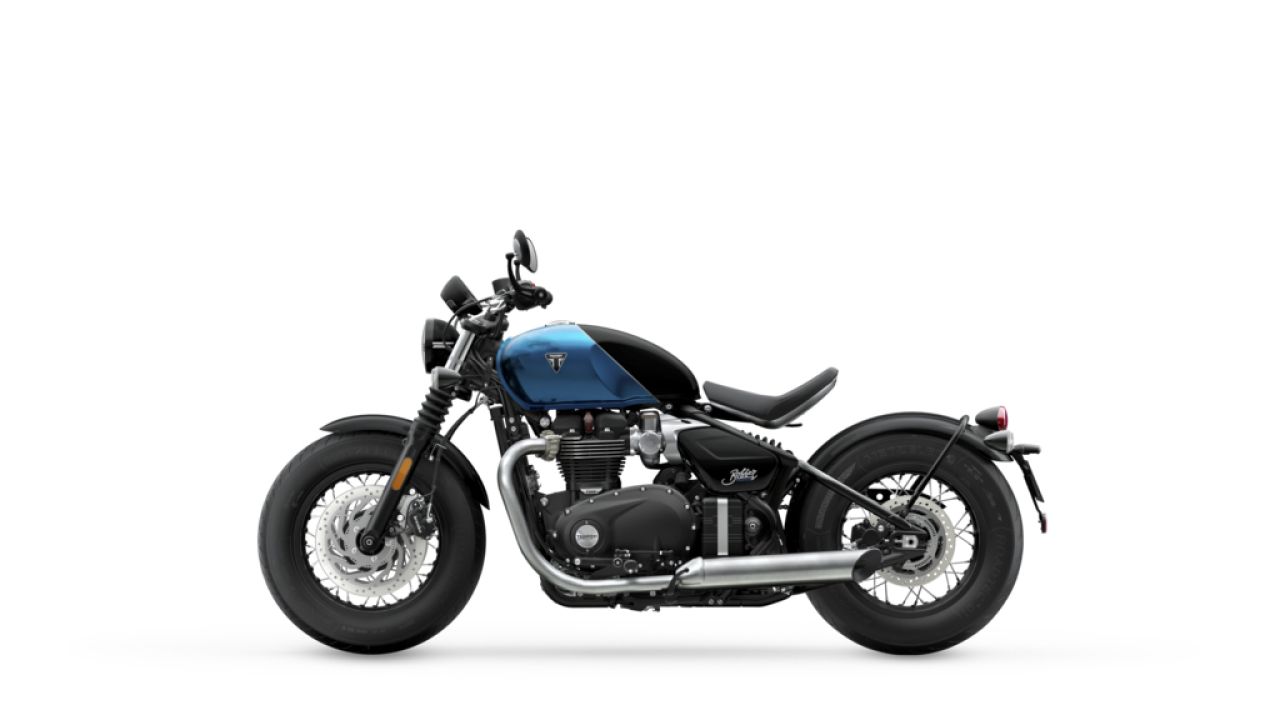 Die Bonneville Bobber wird 2026 in drei Farbkombinationen zu haben sein: Interstellar Blue/Sapphire Black, Satin Mineral Grey/Satin Sapphire Black und Jet Black.