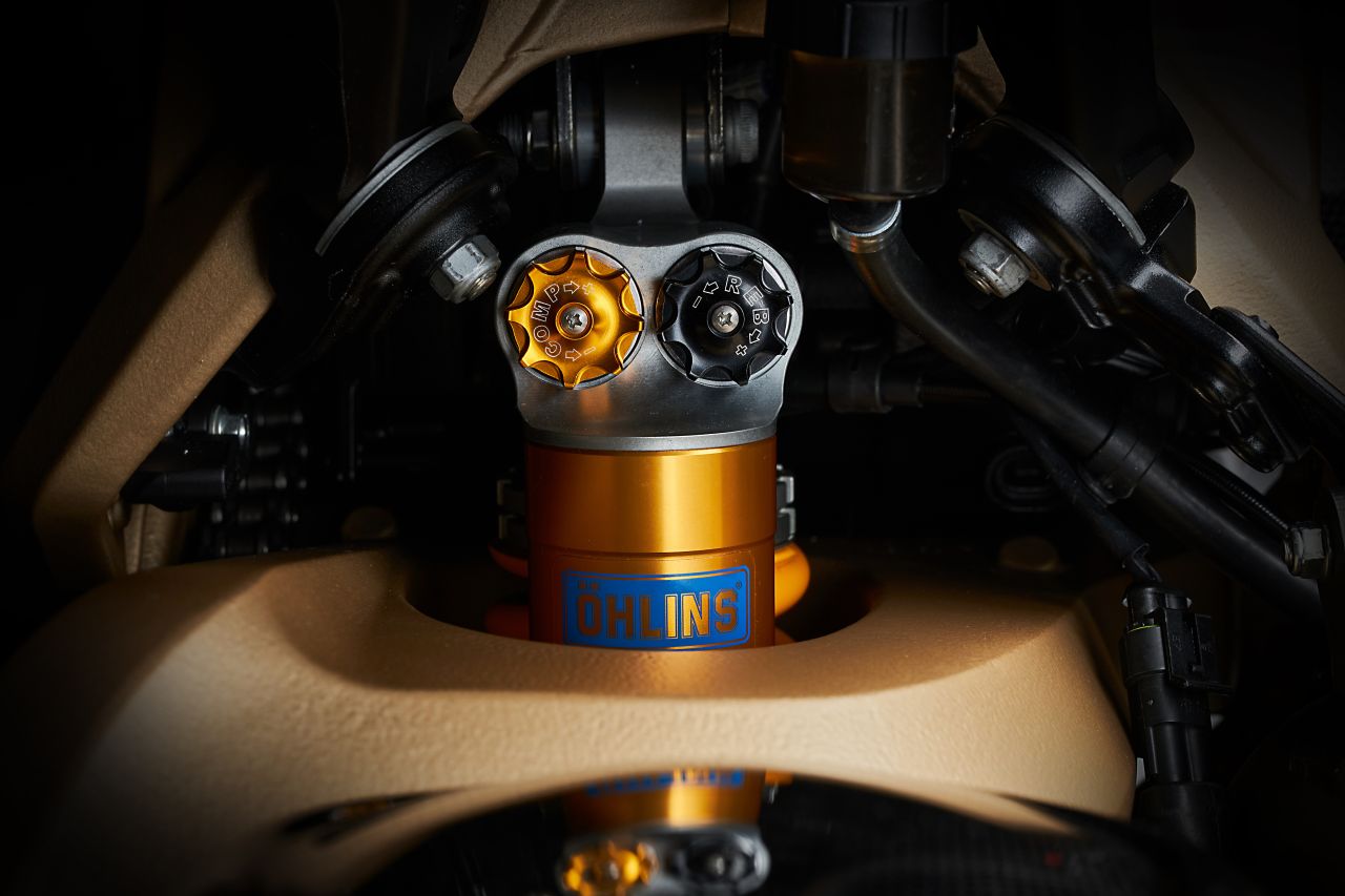 Deswegen wissen wir momentan auch nicht, wie das Fahrwerk beim darauf folgenden Standardmodell aussehen wird. Bei der Serie Oro kommen jedenfalls allerfeinste Öhlins-Komponenten zum Einsatz: eine 43er-NIX-Gabel und ein TTX-GP-36-Federbein mit Ausgleichsbehälter, beides natürlich voll verstellbar. Federwege: 120/133 mm. Und bei der Bremserei feiert Brembos neue Hypure-Zange ihre Premiere in diesem Segment.
