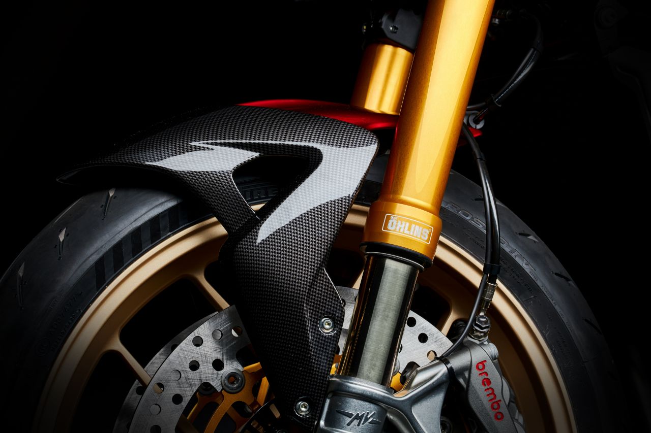 Spannend auch, weil MV Agusta viel am Fahrwerk gemacht hat. Kleiner Einschub: Wir reden hier zunächst von der Serie Oro – einer limitierten Kleinserie, mit der MV Agusta traditionell eine Markteinführung beginnt. Auf nur 300 Exemplare limitiert wird hier das Beste vom Besten verbaut. Zum Beispiel Schmiederäder (mit Pirelli Diablo Rosso IV), die zwei Kilo gegenüber Gussfelgen einsparen. Oder ein Titan-Termignoni, der einen Kilo einspart. Oder viel Carbon, das wahrscheinlich gar nichts einspart, aber einfach nur großartig aussieht.