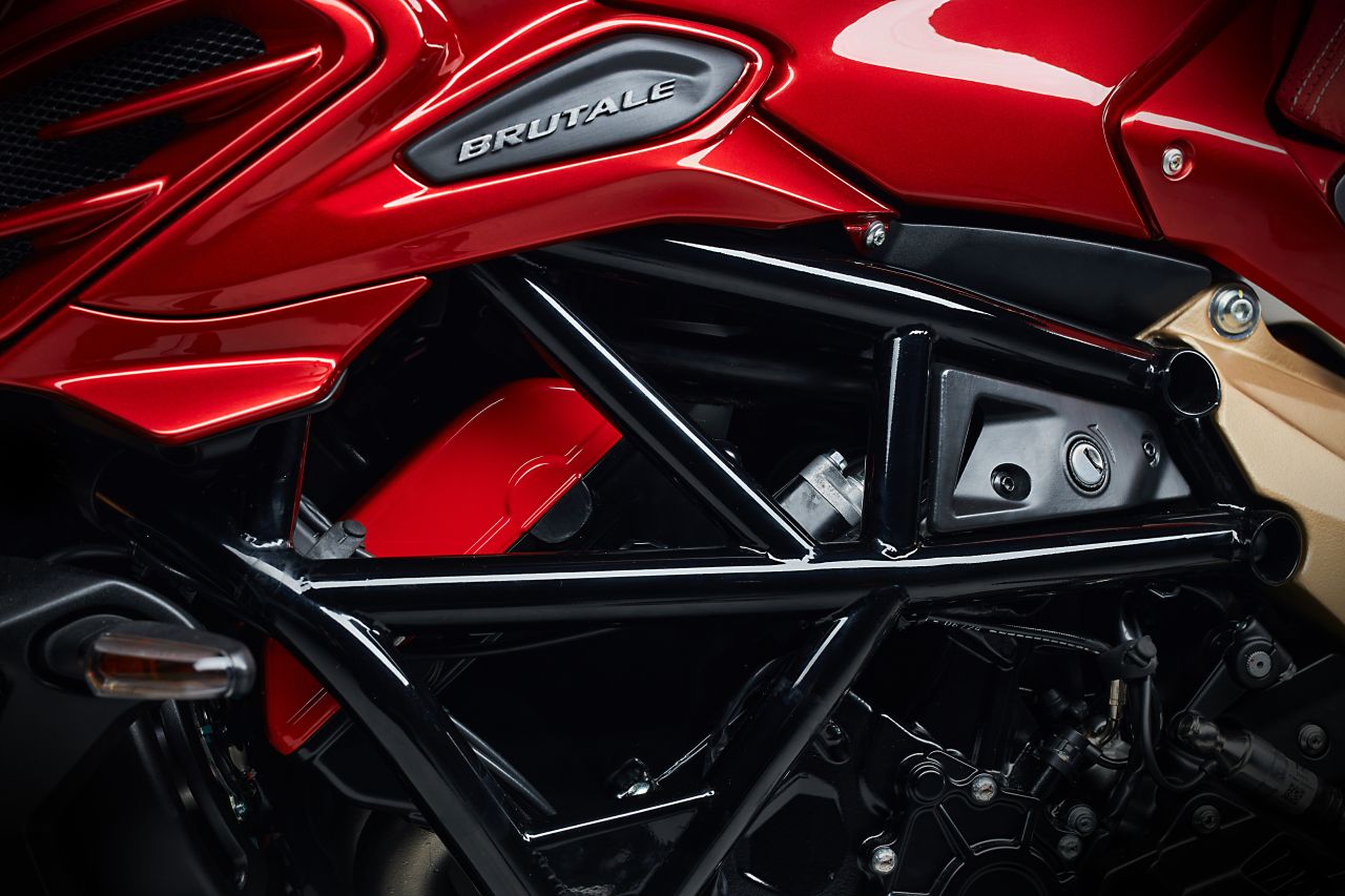 Falls man es doch wieder ändert: Der logische Name wäre Brutale 950, denn sie hat natürlich den neu entwickelten Dreizylindermotor im Gitterrohrrahmen, der bei der Enduro Veloce debütierte. Gegenüber der Reiseenduro habe man allerdings so viel am Motor verändert, dass man im Grunde von einem komplett neuen Aggregat sprechen könne, sagen die Techniker. Ein paar Beispiele: Der Zylinderkopf ist völlig neu, unter anderem mit viel aggressiveren Nockenprofilen; Ansaug- und Auspufftrakt sind anders, die Kolben und damit der Brennraum, die Airbox, das Kühlsystem (sowohl Wasser- als auch Ölleitungen), die Kupplung. Deswegen heißt der Motor jetzt auch: 950 Evo.