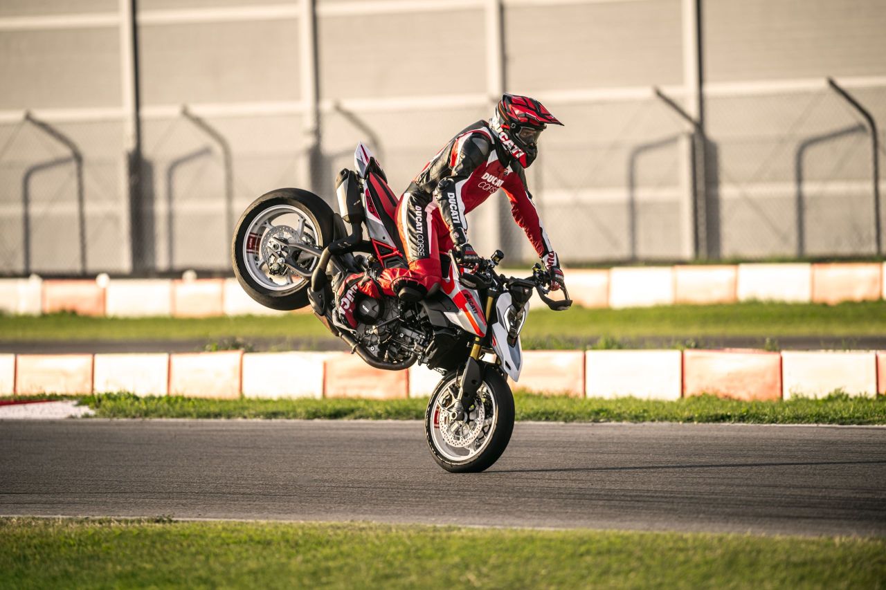 120 PS, 94 Nm und viel Schmalz von unten. Der völlig neue 890-ccm-V2 ist Ducatis leichtester Zweizylinder (54,4 kg) und kommt mit IVT (variabler Einlass-Ventilsteuerung). Das Ergebnis ist bekannt: ein breites, über einen großen Drehzahlbereich nutzbares Band – über 70 % des Maximaldrehmoments liegen schon bei 3.000 U/min an! Nach oben dreht der Twin trotzdem über 11.000 U/min. Ducati hat die Übersetzungen gegenüber dem Vormodell verkürzt und damit die Beschleunigung weiter gesteigert. Erfreulich ist, dass eine Ventilspielkontrolle nur alle 45.000 km fällig ist, was den Servicebedarf bei den erwartbaren Jahreskilometerleistungen einer Supermoto drastisch reduziert. Bemerkenswert: Trotz aller Macht will Ducati auch eine A2-Version (35 kW) liefern, die dann im entdrosselten zustand wohl nur 95 PS leisten darf. Ein wesentliches Detail, um die Power flott auf den Asphalt zu bringen, ist der neue Quickshifter 2.0. Noch harmonischere Gangwechsel und noch kürzere Schaltwege werden dabei von Ducati versprochen.