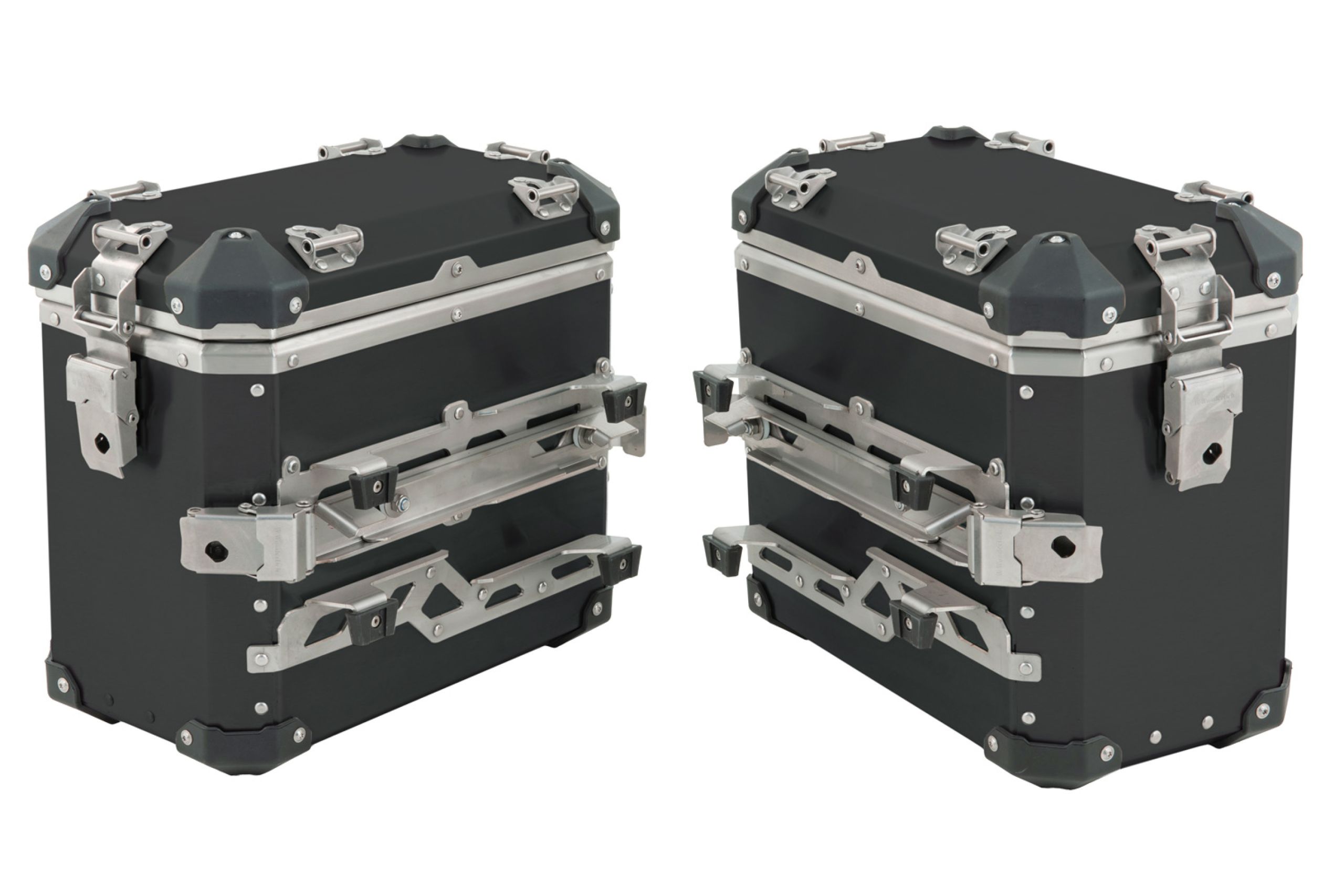 Das Volumen beträgt 2 × 38 Liter, zusammen großzügige 76 Liter. Wunderlich fertigt sie wahlweise in purem, unbehandeltem Aluminium oder schwarz-pulverbeschichtet. Die unbehandelte Variante spricht Puristen an, die die ursprüngliche Materialität schätzen, während die schwarze Ausführung technisch und edel wirkt. Für den Koffersatz bietet Wunderlich Schließzylinder mit Gleichschließung an.