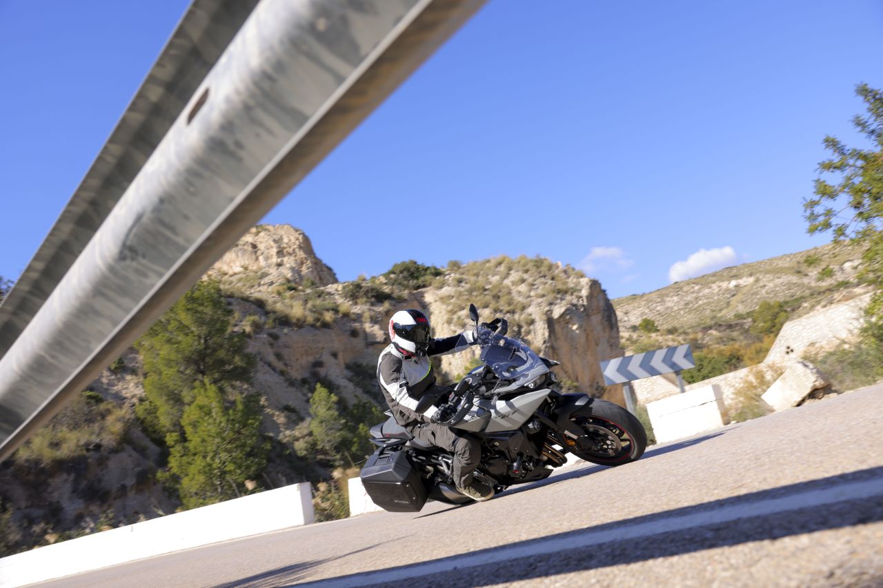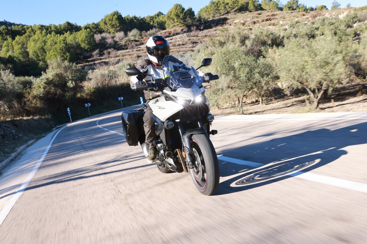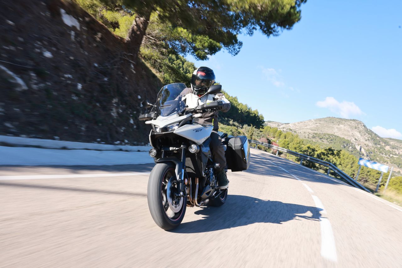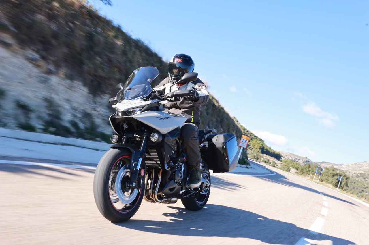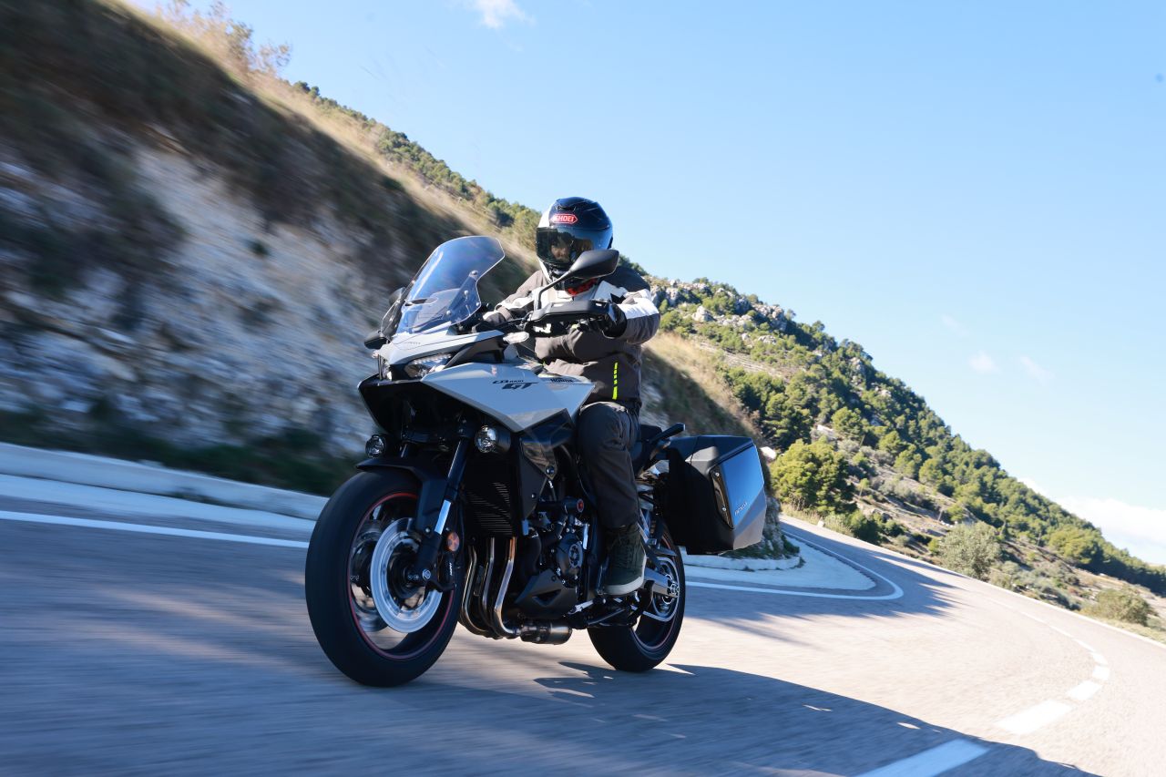 Die GT vereint zwei Tugenden: Sie nimmt die Agilität und Präzision der Hornet mit, bietet aber in den Bremszonen und im Radius mehr Stabilität, bewirkt vor allem durch die längere Schwinge und das elektronische Fahrwerk, das je nach gewähltem Fahrmodus schneller auf die aktuelle Situation reagieren kann als der Mensch blinzeln. Das Motorrad ist über den hohen und breiten Lenker noch leichter und bei Bedarf forscher zu dirigieren als die Hornet, wird aber nie nervös oder kippelig. Und sie fühlt sich nicht an, als würde sie auf Stelzen stehen wie manches Crossover-Bike.