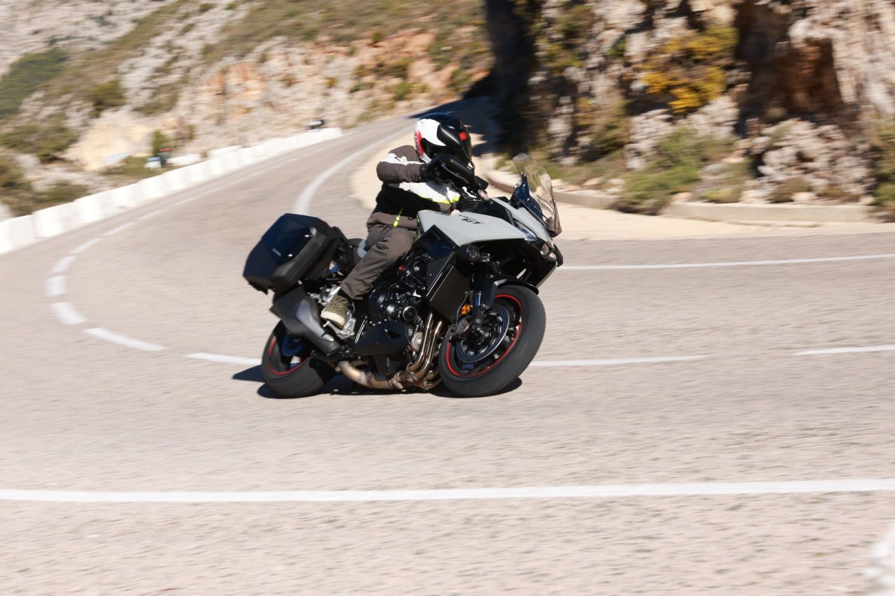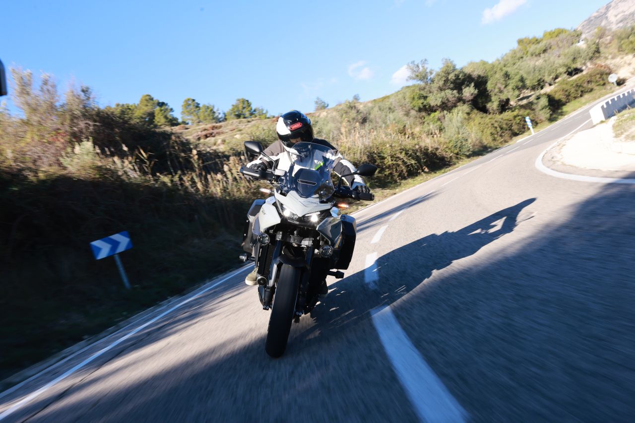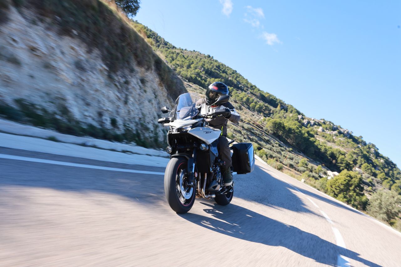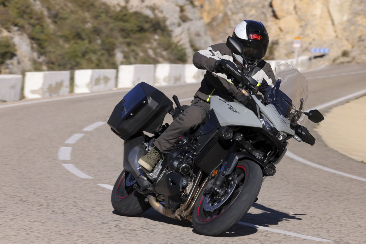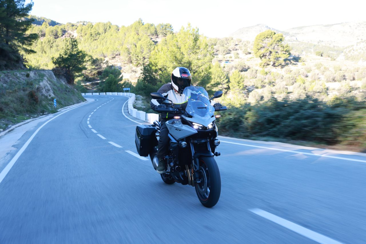 Die GT vereint zwei Tugenden: Sie nimmt die Agilität und Präzision der Hornet mit, bietet aber in den Bremszonen und im Radius mehr Stabilität, bewirkt vor allem durch die längere Schwinge und das elektronische Fahrwerk, das je nach gewähltem Fahrmodus schneller auf die aktuelle Situation reagieren kann als der Mensch blinzeln. Das Motorrad ist über den hohen und breiten Lenker noch leichter und bei Bedarf forscher zu dirigieren als die Hornet, wird aber nie nervös oder kippelig. Und sie fühlt sich nicht an, als würde sie auf Stelzen stehen wie manches Crossover-Bike.