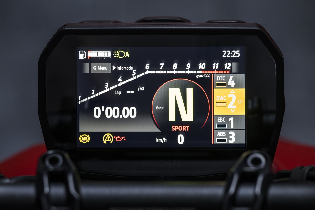 Die Menüstruktur wurde ebenfalls überarbeitet und macht die Konfiguration der Elektronik noch einfacher. Zum Serienumfang zählen beim Standardmodell weiter ein Sachs-Lenkungsdämpfer und der Quickshifter 2.0. Das Öhlins-Fahrwerk, eine Lithium-Ionen-Batterie und die Monoposto-Konfiguration bleiben der S-Version vorbehalten. Dafür muss man hier den Sozius dazukaufen, ebenso die Connectivity, eine USB-Steckdose, die Reifendruckkontrolle und den Tempomaten.