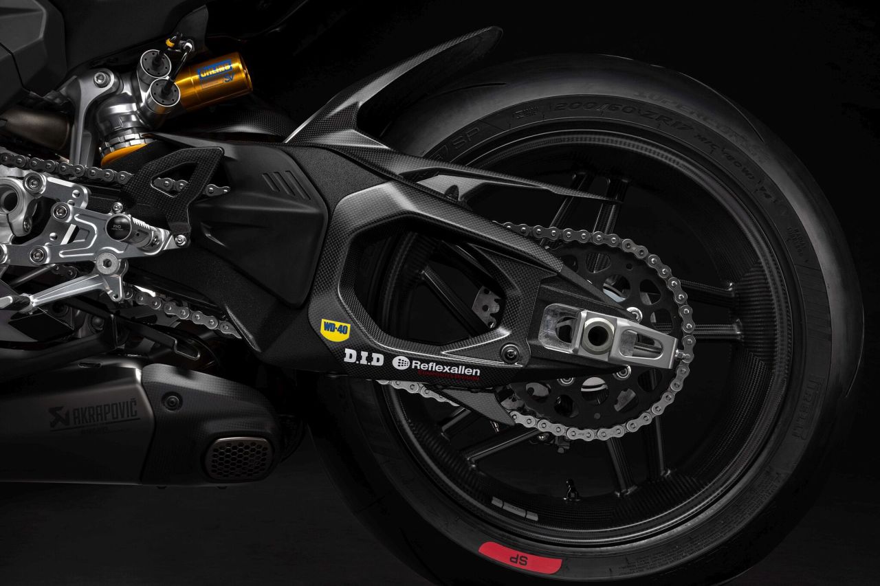 Sie ist mit Corner Sidepods ausgestattet, einer Aerodynamiklösung, die Ducati 2021 in der MotoGP eingeführt hat und die bei hohen Schräglagen Bodeneffekt erzeugt. Dies sorgt für mehr Reifengrip und ermöglicht höhere Kurvengeschwindigkeiten, was zu schnelleren Rundenzeiten führt. Die Fünfspeichen-Carbonfaserräder reduzieren das Gewicht im Vergleich zu den Schmiederädern der Panigale V4 S um 0,950 kg und senken das Trägheitsmoment um 12 % vorne und 19 % hinten. Das Ergebnis ist eine verbesserte Agilität beim Richtungswechsel und eine höhere Neigung des Motorrads, die Fahrlinie beim Beschleunigen in Schräglage zu schließen.