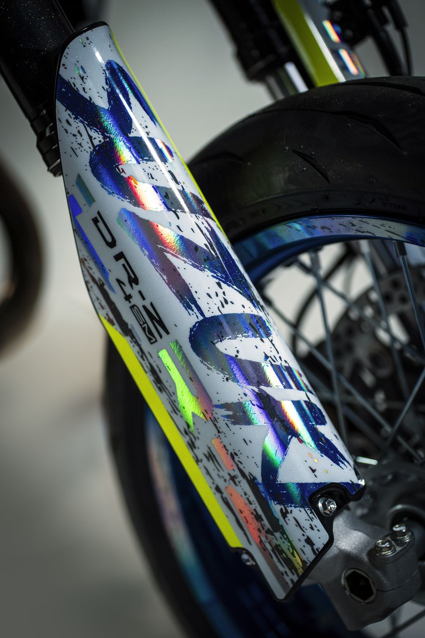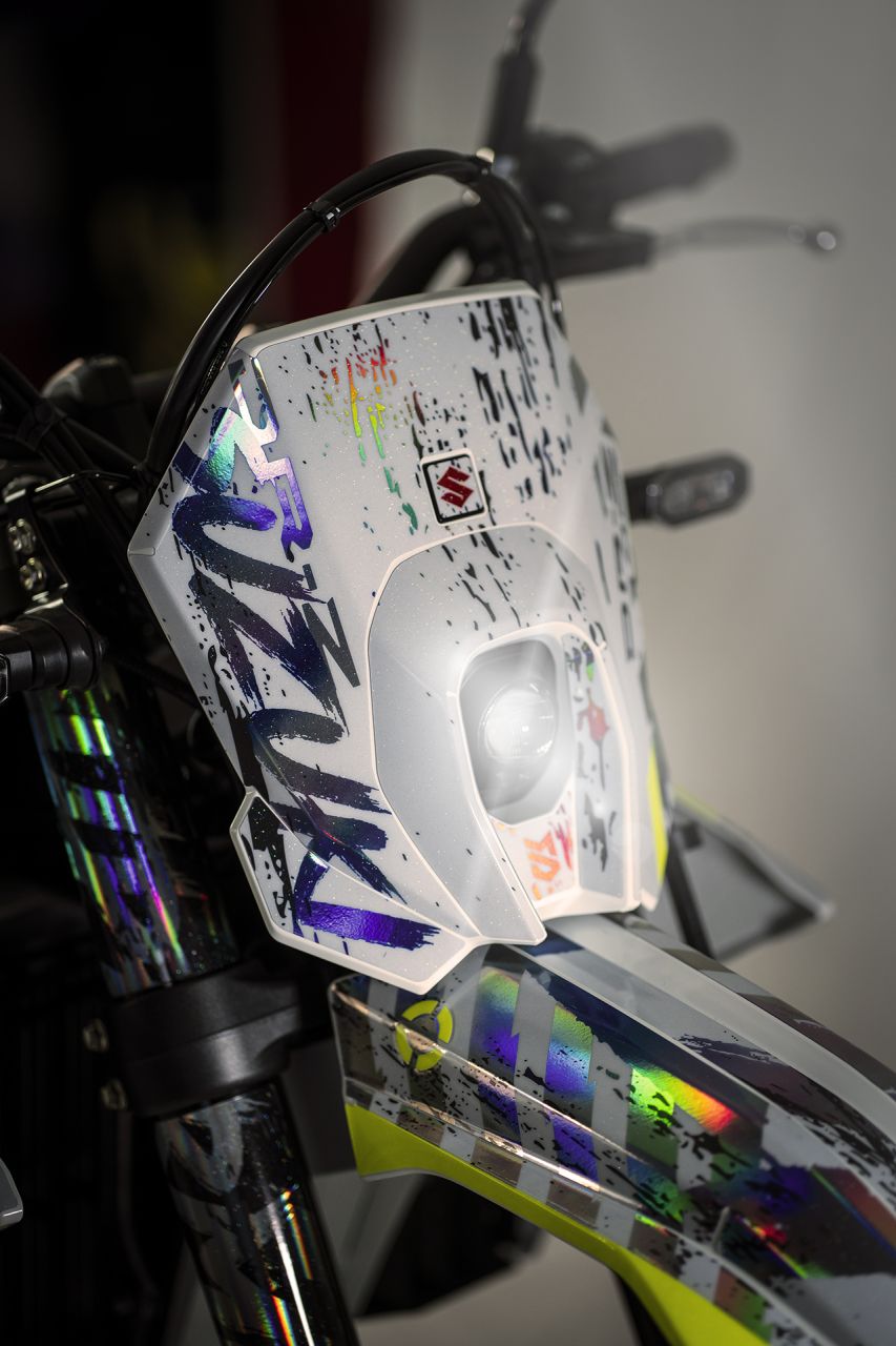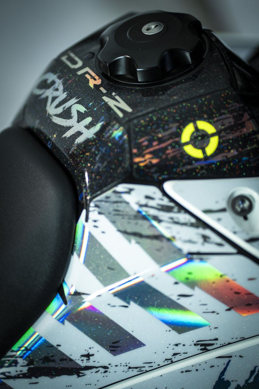Das Stickerset verwandelt die DR-Z4SM aber radikal und gibt der Supermoto einen völlig neuen Charakter. Original-Zitat aus der Aussendung von Suzuki Österreich: „Crush“ lebt vom Kontrast: Graffiti-Ästhetik, „rough“-Strukturen, Farbspritzer und harte Linien – genau dort zuhause, wo eine Supermoto hingehört: zwischen City-Kanten, Beton und kreativem Chaos. Der Look wirkt wie ein „Paint-Splash“ in Bewegung – als hätte man Street Art und Geschwindigkeit zu einem einzigen visuellen Statement verdichtet.“