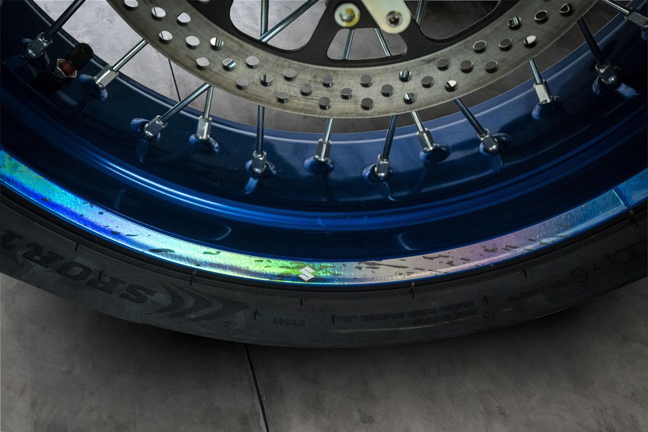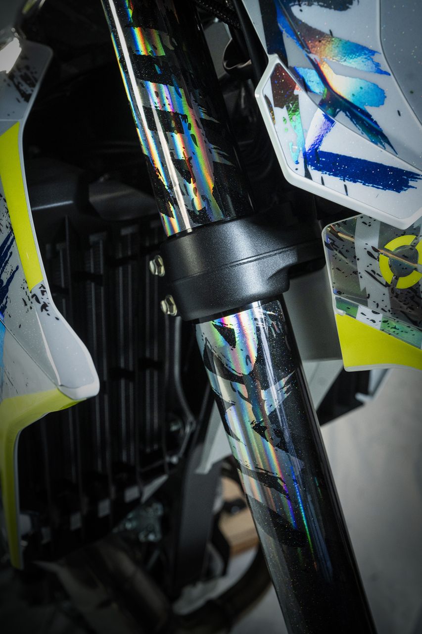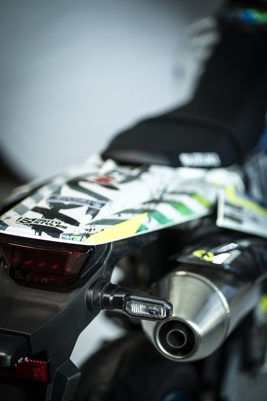 Das Stickerset verwandelt die DR-Z4SM aber radikal und gibt der Supermoto einen völlig neuen Charakter. Original-Zitat aus der Aussendung von Suzuki Österreich: „Crush“ lebt vom Kontrast: Graffiti-Ästhetik, „rough“-Strukturen, Farbspritzer und harte Linien – genau dort zuhause, wo eine Supermoto hingehört: zwischen City-Kanten, Beton und kreativem Chaos. Der Look wirkt wie ein „Paint-Splash“ in Bewegung – als hätte man Street Art und Geschwindigkeit zu einem einzigen visuellen Statement verdichtet.“