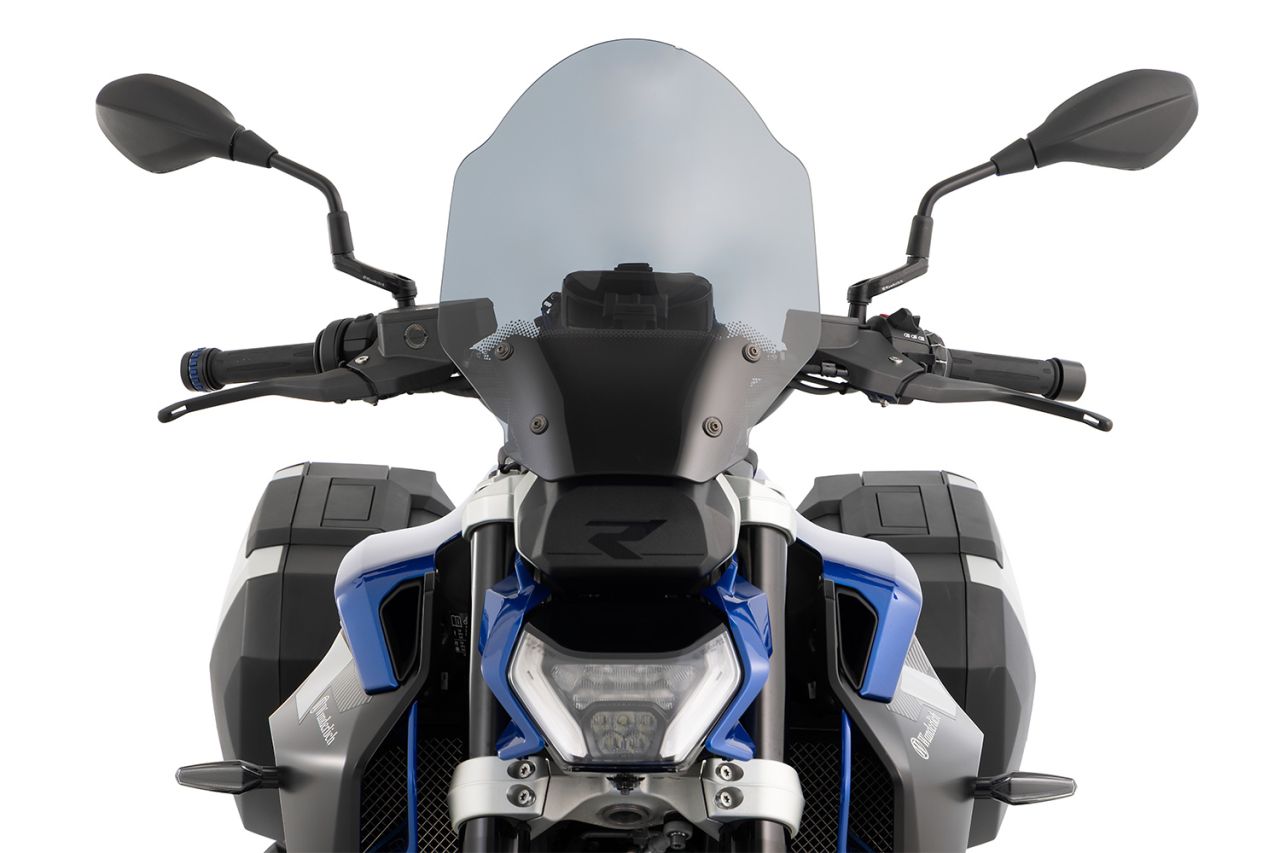 Beginnen wir mit der Marathon-Scheibe: Sie schafft den Spagat aus sehr gutem Wind- und Wetterschutz, gleichzeitig bleibt sie in ihren Dimensionen noch so zurückhaltend, dass sie den Charakter eines Roadsters erhält. Ihre Aerodynamik verspricht den Kopf, die Schultern und den Oberkörper spürbar vom Winddruck zu befreien und damit längere, schnellere Etappen deutlich komfortabler zu machen.